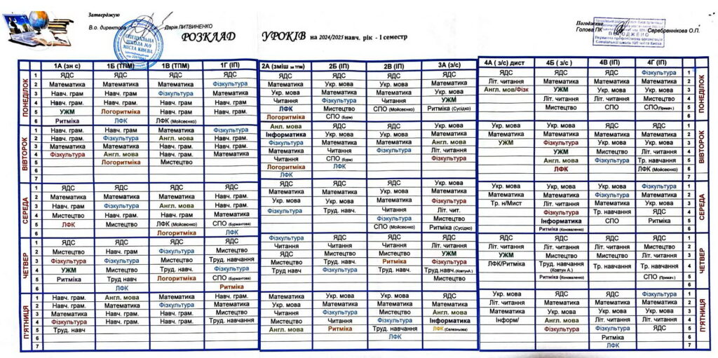 Розклад уроків в 1-4 класах 2024-2025 н.р.